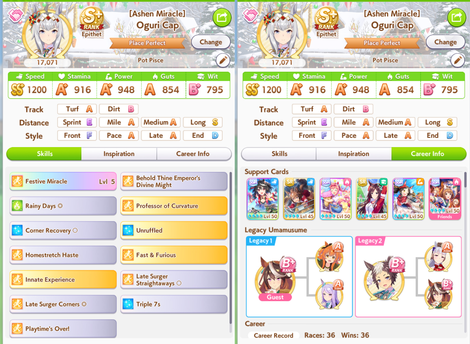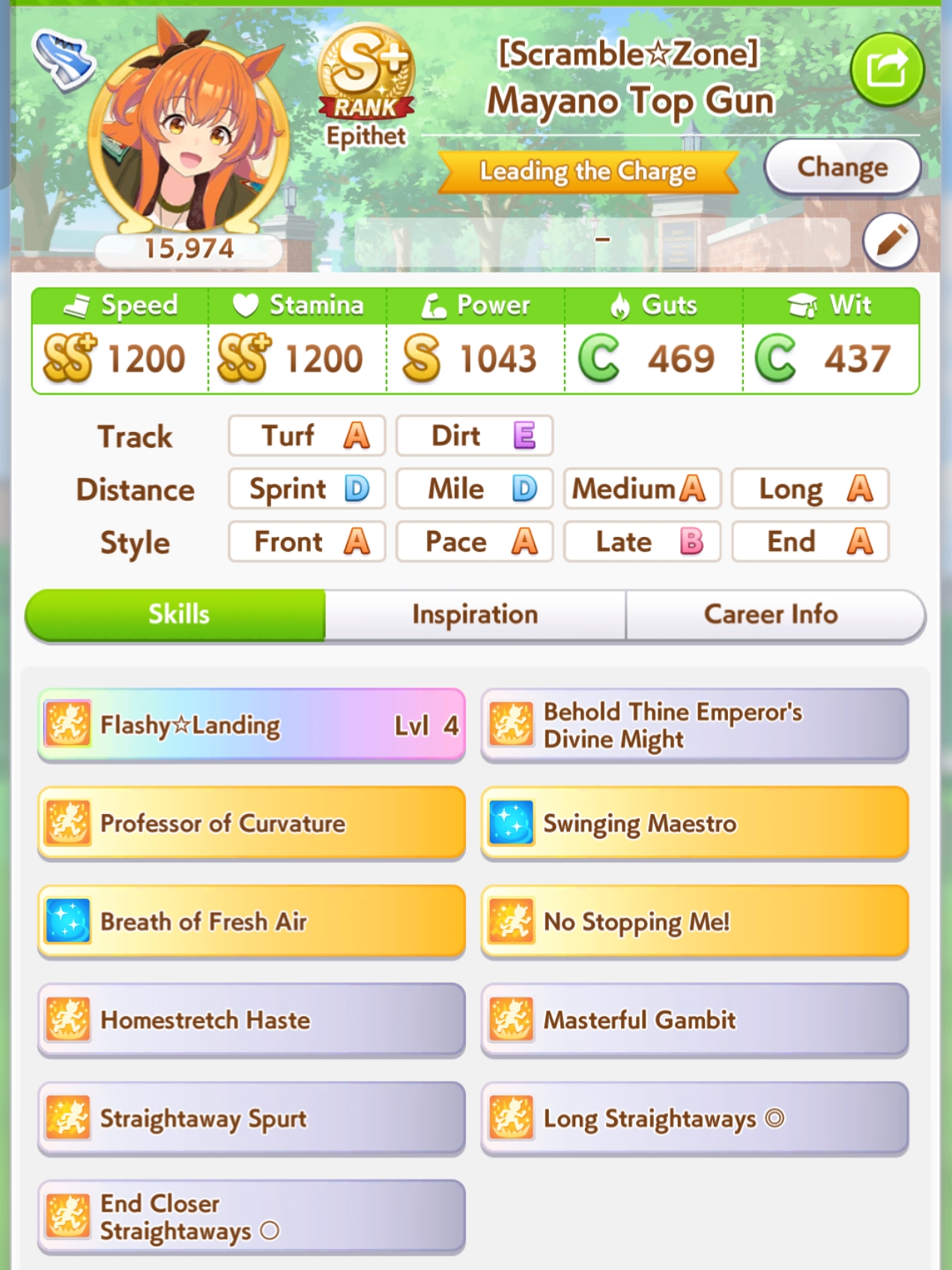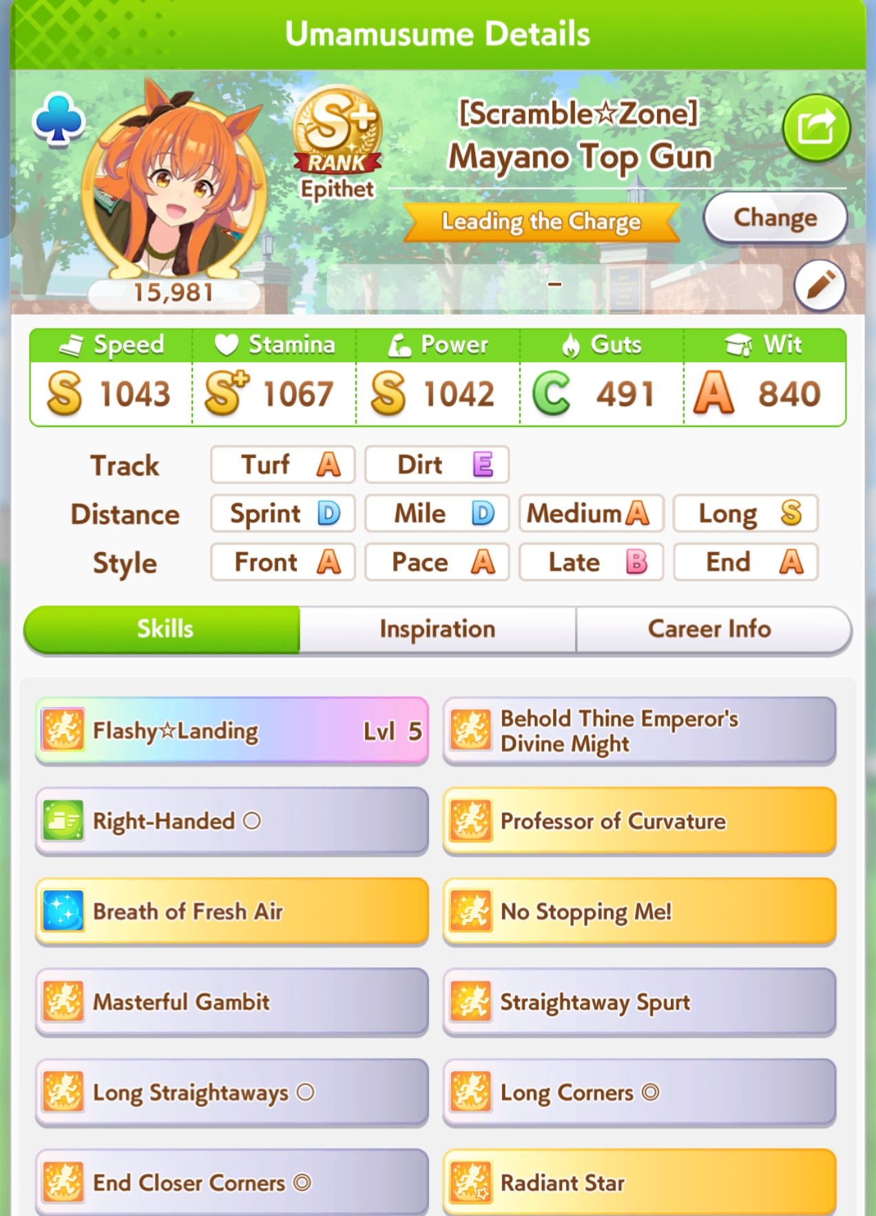 On the subject of Xoguri, I could really use some help. I keep WAY overshooting speed while not getting quite enough stats everywhere else. My parent sparks are all stam aside from 2 power, so I've been messing with my deck trying to balance it (I fucked up and borrowed Bijin instead of Ayabe for this run though) Should I try dropping a guts for another power?Also, is three white + 1 gold enough recovery for her as a late on this cm?