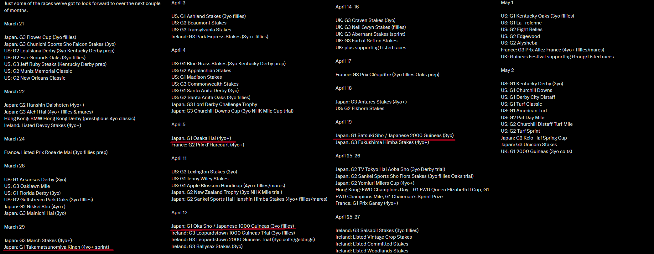 >>735539024There's the Florida and Arkansas Derby, and the Dubai Cup with Forever Young. April is when things pick up in Japan.