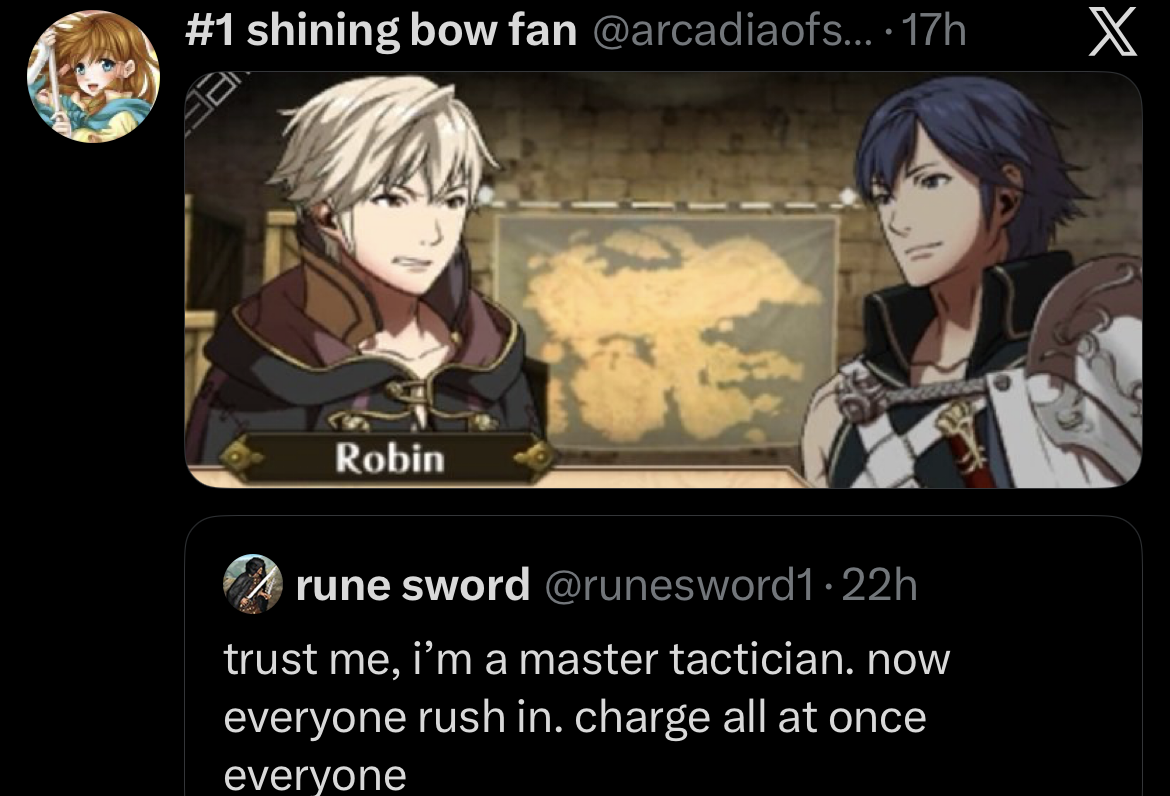 She's not a Yandere she's just like sexually attracted to the person who is literally the child of her evil dark god and would do anything for them I think that's neat. I find it funny how she's just consistently a good person in her supports with the typical route being, "hey you've got a problem that could be solved with magic you know let's solve it with magic". Shout out to her support with Nowi where we see one of the few instances of the mask drop from Nowi where her intentionally bubbly and slightly immature personality she keeps up since it makes people feel more comfortable around her is cut away for her to act seriously.