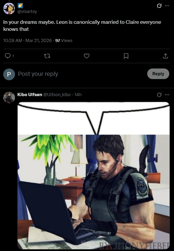 >RE2>spends the entire game obsessing over Ada, speaks to Claire on radio maybe twice>RE4>spends most of the game babysitting Ashley, casually NWFs her, talks only business with Hunnigan aside from a post-credits gag, the rest is him bantering with Ada like they're a married couple>RE6>Leon's a simp for Ada: the game>RE2R>the game that launched Chrisposting, Claire is completely cucked while Ada and Leon kiss>RE4R>Ashley continues her very one-sided crush on Leon, only game where Leon and Ada have zero chemistry but that's entirely due to Ada's shit VA>RE9>zoomers who haven't played the series are acting like the series has ever for a single fucking moment pretended that Leon and Ada haven't been designated lovers from minute 1
