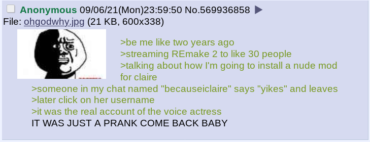 >>735583758>so many faggots have deluded themselves into thinking of Leon as a "big brother" when they barely interacted in the remake timelineBecause it reminds them of their own life.