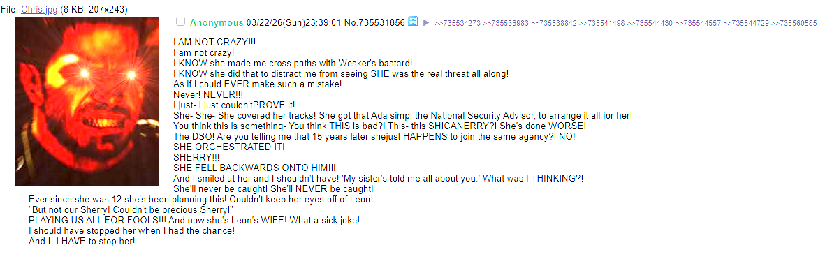 >>735557771>Capcom already revealed that Leon is taken and soon will announce by whoI will laugh my ass off when Capcom reveals that Leon's wife is some literal who instead of any of them (which will happen most likely).