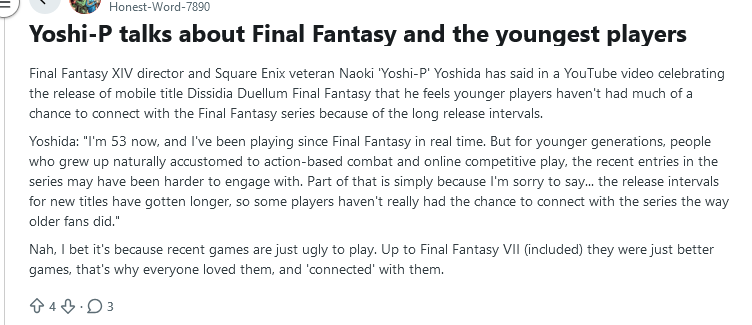 Maybe they should embrace their demographic then and make a turn based final fantasy about a person who recently has transferred from being a young adult to an adult who has to explore all their new responsibilities with family and parents dying