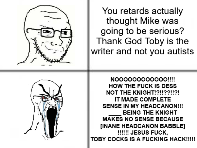 whoever knight actually ends up being, comedy ends up winning, looking forward to the fallout from the madmen either way>knight is december'muh subverted expectations' crowd gets bootyblasted over how a mysterious antlered foe ended up being a holiday girl who disappered under mysterious circumstances>knight is literally anybody elsemike 2.0 outrage over toby ABANDONING and BETRAYING their headcanon, followed by the realization that fandom made up an OC waifu that is getting zero screentime and is just a complete fanartist fabricationfuture's looking bright in 202X boys!