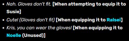 >>735596305>I wonder if the "Noelle is actually supposed to be your party member instead of Susie" theory will be verified soon.It's actually literally the opposite. The point of the weird route is to play the game the way Noelle plays videogames: intentionally doing a weird, unintended strategy (in this case, taking a temporary party member and grinding levels with them until they can beat the final boss solo) just because it's fun to break the rules.