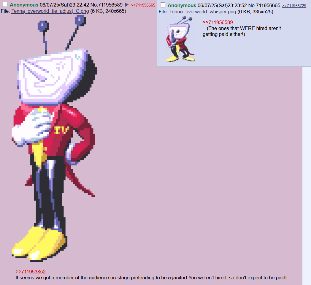 >>735600826That's not what's happening. Even if Kris and The Knight came up with these characters years ago, they're independent beings. Darkners don't have to do whatever the person who made their Fountain wants, they have their own motives and personalities.King is explicitly motivated by resentment over being left alone in the abandoned classroom and not being played with by anyone for years. Queen received no instruction from The Knight whatsoever, she just acted in her own self-interest imitating The Knight. And Tenna had to be compelled by Kris's dealing and threats.All of them were being used by Kris and The Knight. Used and discarded, or broken. They don't know what's going on.