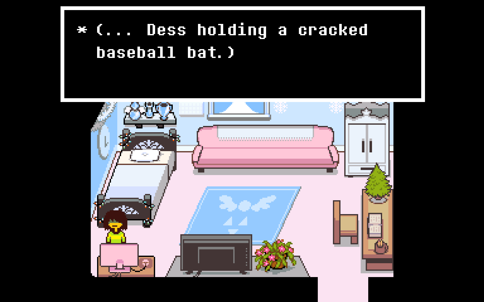 >>735587039>i highly doubt the bat is dented because she whacked kris with it The game heavily implies that this is the case and there is no other explanation for why the bat in her room is like that