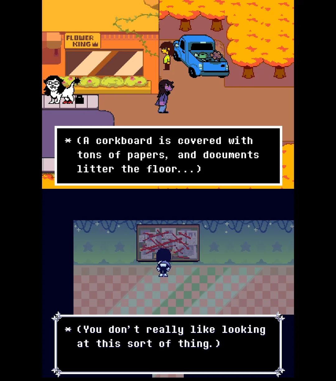 >>735588963>The knight has a bat>Dess beat Kris with a bat to punish him for his pranks and Kris remembers this during his fight with the knight>Dess is conspicuously missing, there is an unresolved plot point regarding a girl who was lost in the dark, and the knight is a feminine creature that has been completely consumed by darkness>Dess's room has posters corresponding to the knight's moves>Kris's devotion to the knight as well as him sharing its mannerisms and fighting style is explained by her being Dess>The knight has FUCKING DEER ANTLERS