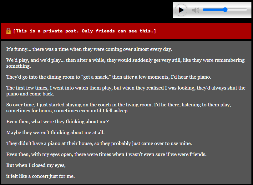 >>735600621>her yearning for the time when she and kris were super closeIn this anecdote we learn that Kris regularly sneaked off to play the piano for hours at a time while Noelle listened in the other room."Even then, there were times when I wasn't even sure if we were friends."Was there a connection there? Sure, definitely after Dess disappeared. Were they close friends in a normal way? No.