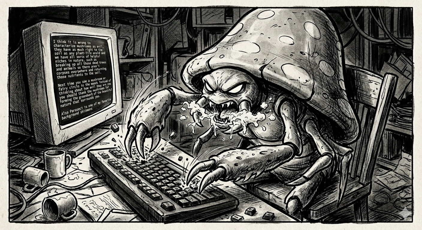 Fungi are the most misunderstood things on this planet. They're the biggest organisms, the cap is just a by-product, they shape our entire world by decomposing lignin and they are fucking evil. They are 100% evil. Their only intent is to do harm to anyone stupid enough to fuck with them.