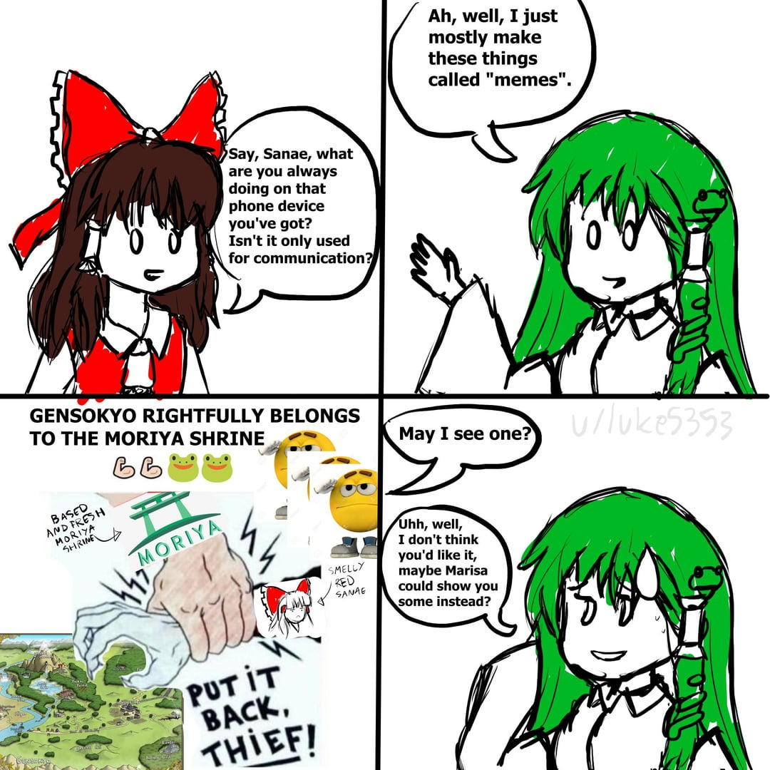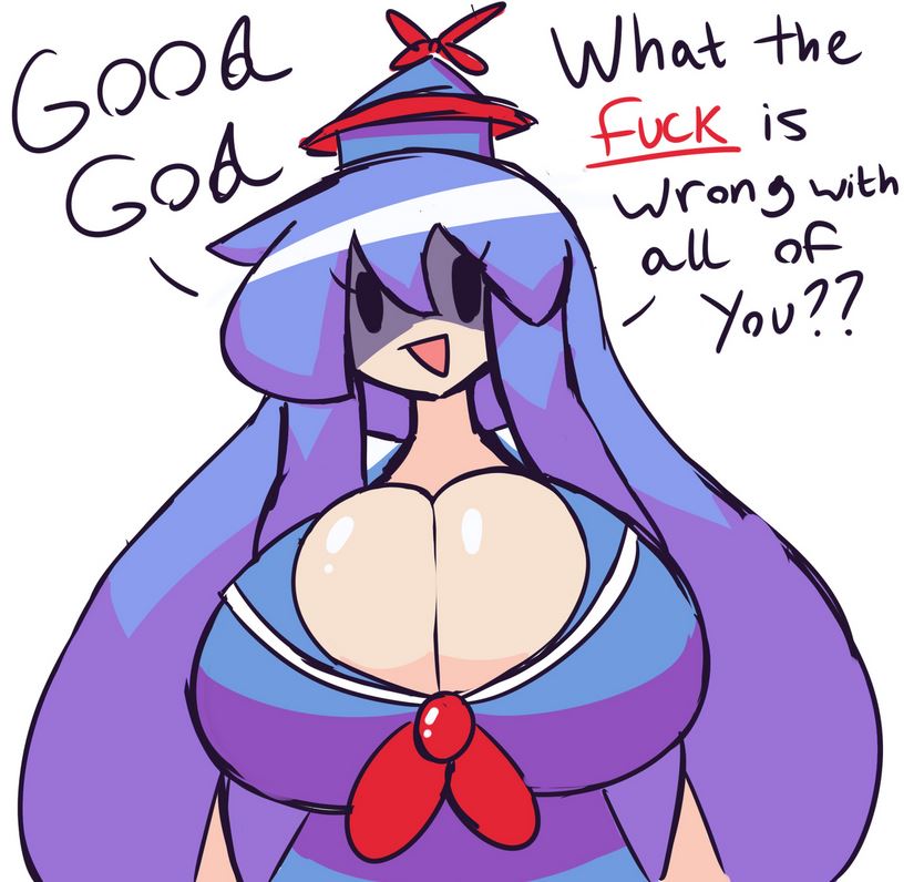 To an outsider like me, I have to respect the level of autism of Touhou. Zun, this funny, little Japanese man, sat down somepoint in the 90s and decided:>He was going to make a series that was 99% female, like a gacha appealing to lonely men>Did most, if not all the art himself>Make absolutely busted characters from a writing standpoint: dude, what if we gave a loli the power to easily wipe out Tokyo?Also, somebody from another Touhou thread wanted me to post plump reimu having seggs: Catbox is currently down.