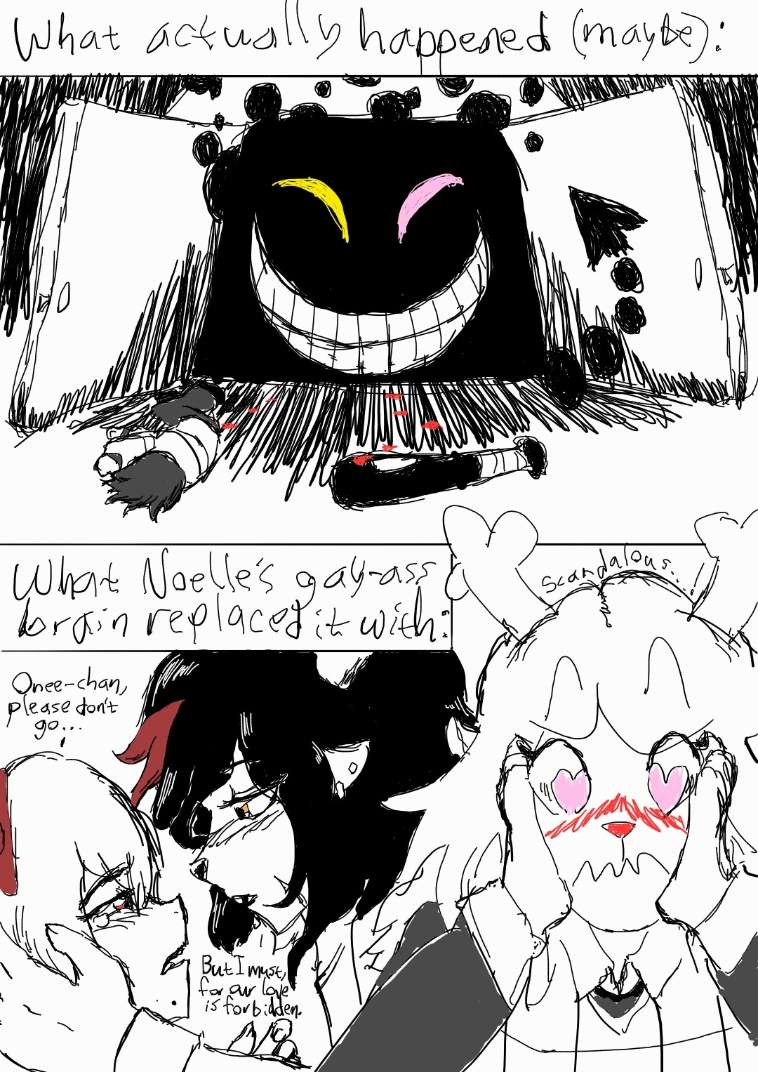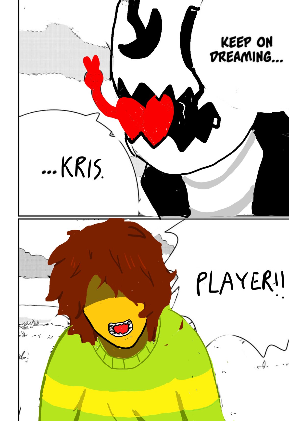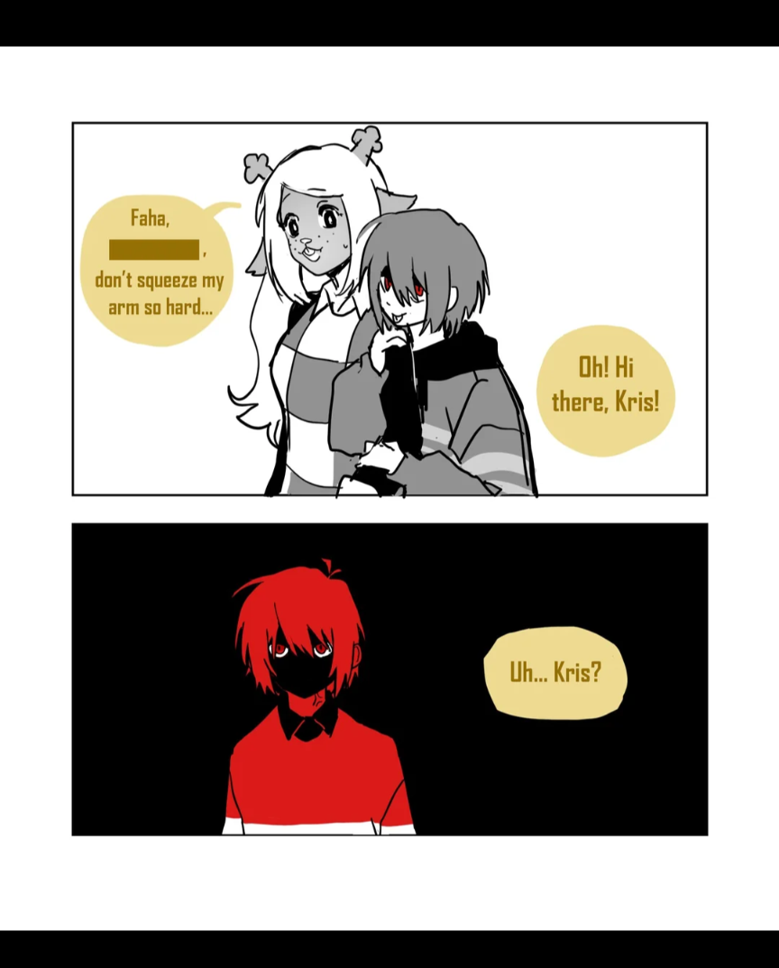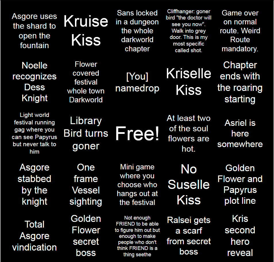 >Ends with ROARING happening, Kris switching sides and pulling us out permanently. Cliffhanger is everyone entering the shelter to mirror Frisk exiting the RUINS door.