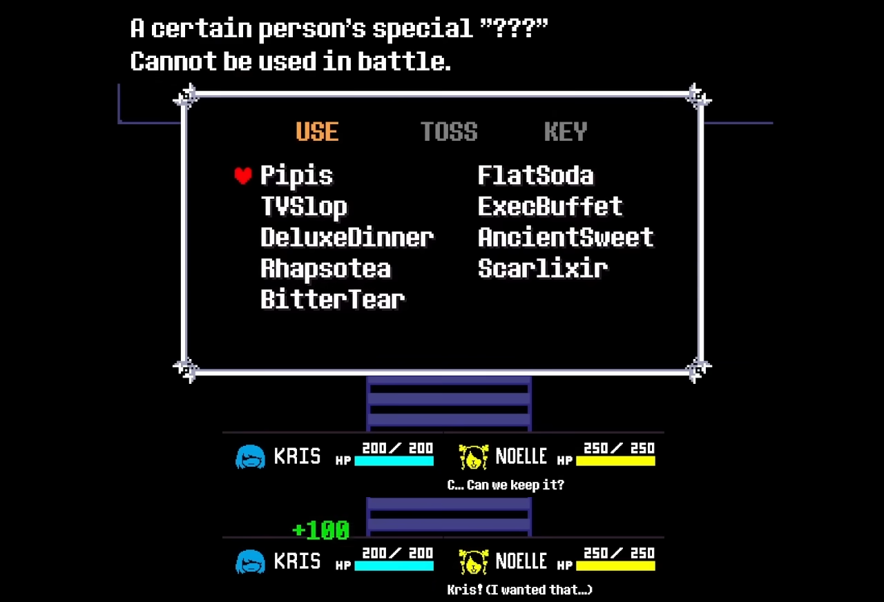 >Kris reveals his agenda to the player and Susie, potentially even abandoning the player for whatever Carol or the Knight has laid out for him.