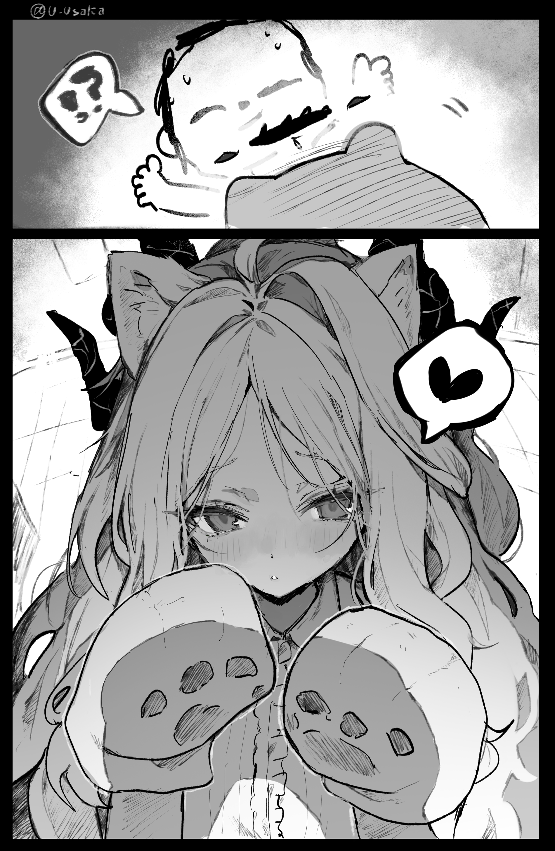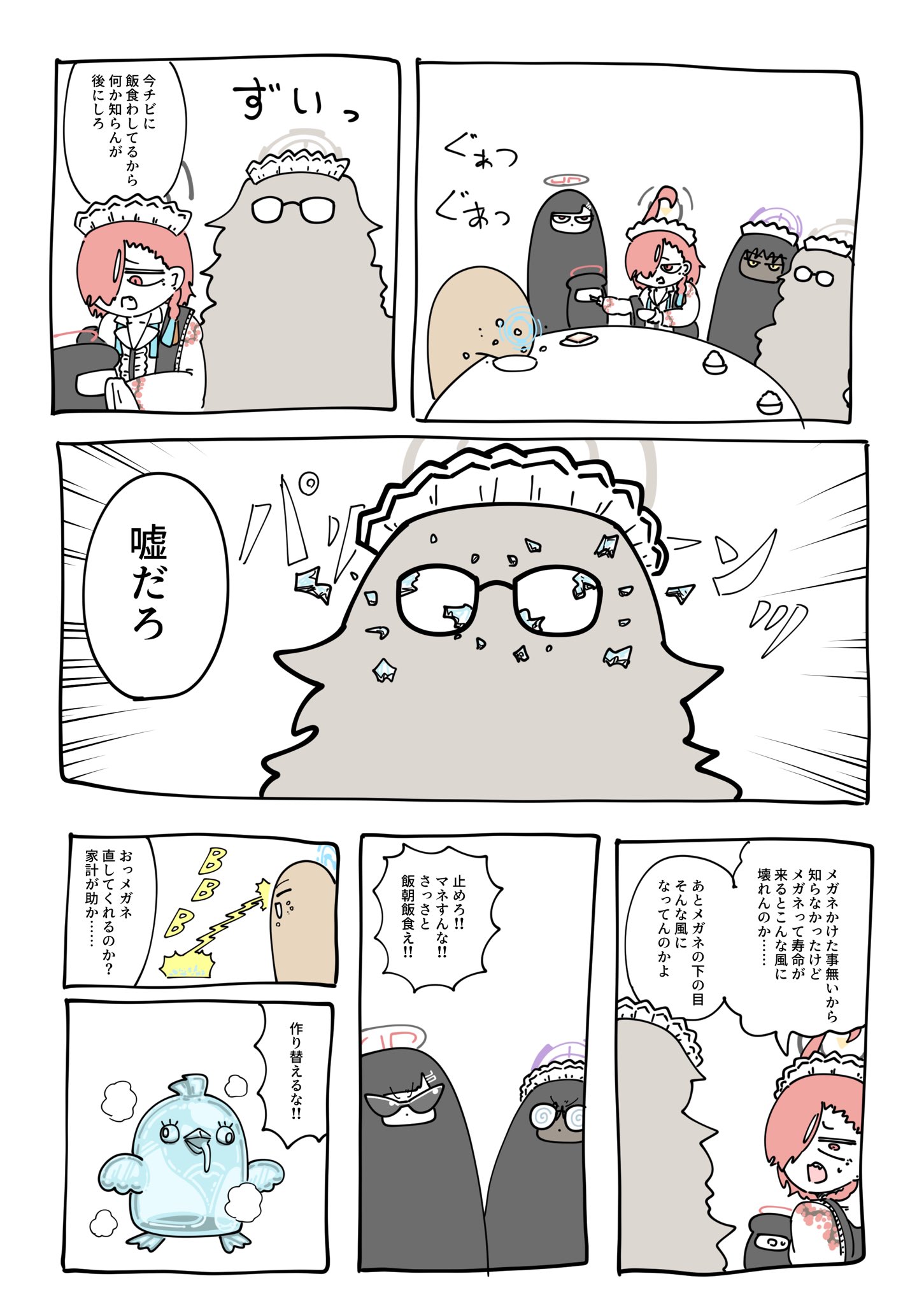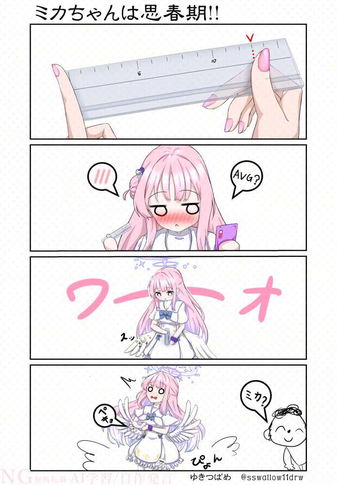 >>735729384This image is a four-panel comic strip featuring the character Mika Misono from Blue Archive. The title translates to "Mika-chan is in puberty!!".Mika is shown holding a ruler and later looks surprised or shocked while looking at her phone.The comic appears to be related to a video focusing on Mika.It is drawn by the artist @sswallow11drw.