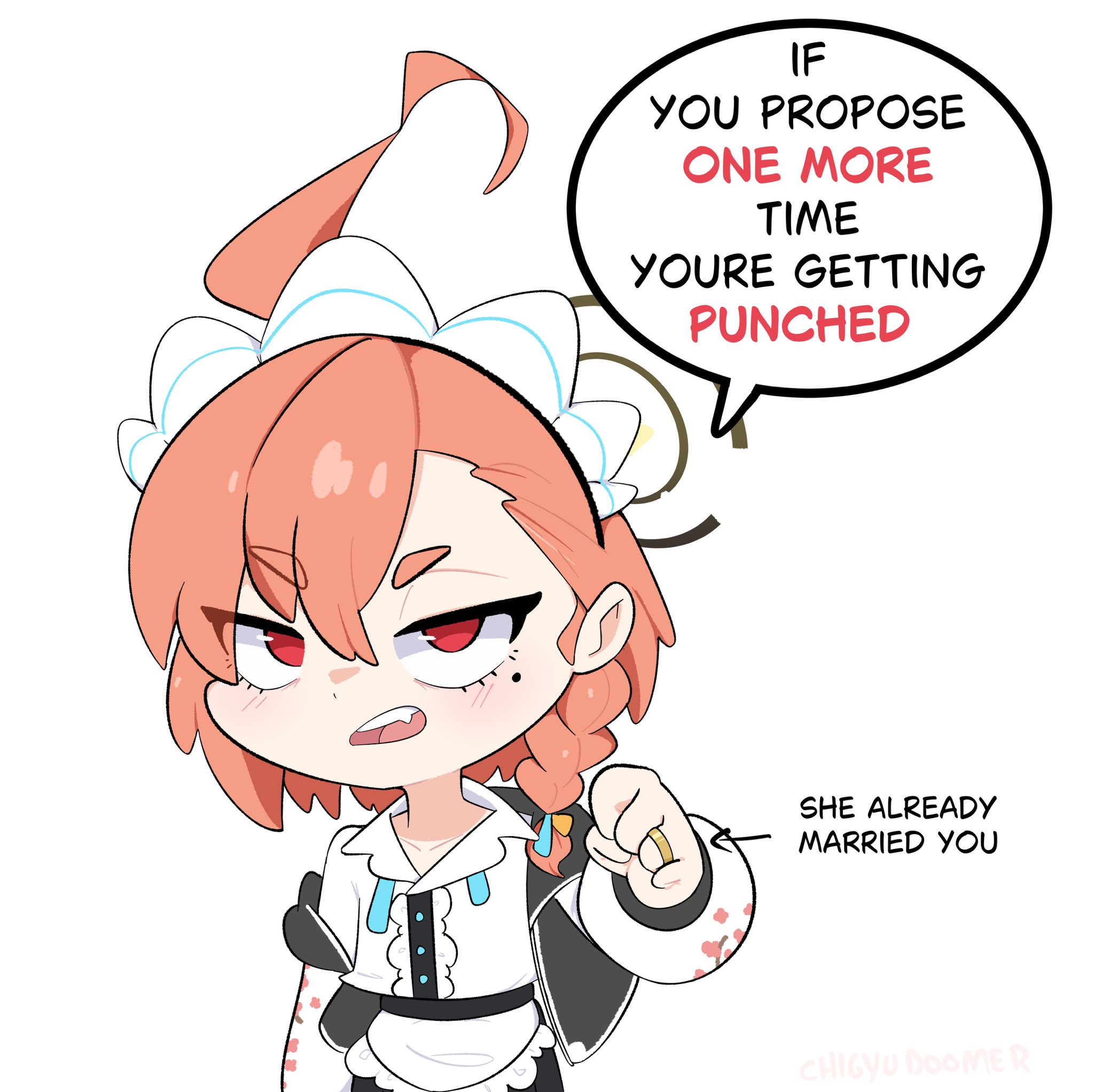 >>735742441Small tomboy thats a little tsundere from the millenium school(a school for nerds)She is the presindent of the maid club Cleaning & Clearing(C&C) thats secretly a special forces squad that sexretly handles evildoers and dangers to the school(everyone knows that)