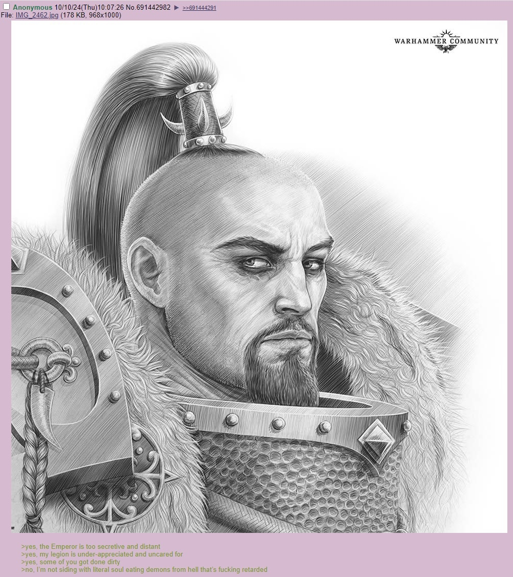 >>735766902Don’t forget lore destroying retcons, relegating the sisters of silence to complete irrelevancy because of femstodes, and the wahhhhh everyone is opressed im a victim! Mentality of every faction. Except black Templars. So chud coded they’re still based psychopathic hypno induced Emp-cultists who wipe planets clean because one guy recited a litany wrong. Broken crusade was one of the only bearable recent BL books and that’s because it treated faith, and lack of faith, as serious topics with nuance, not just EMPRAH BAD or EMPRAH GOOD