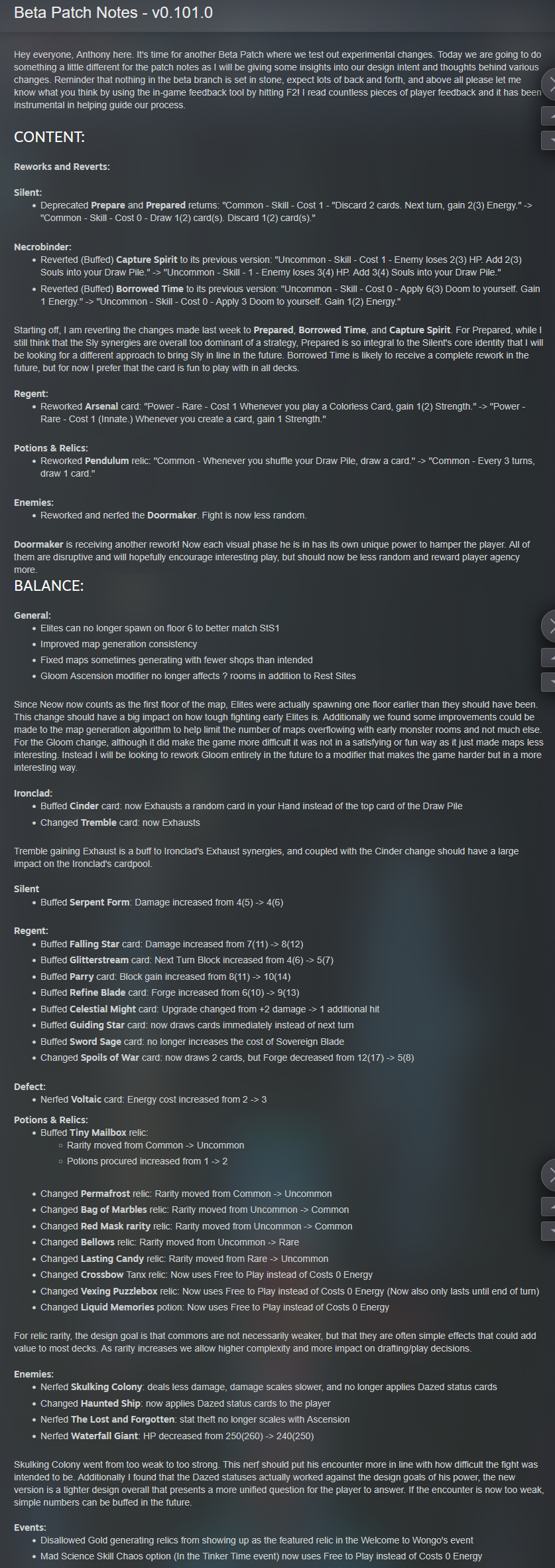 >Nerfed Skulking Colony: deals less damage, damage scales slower, and no longer applies Dazed status cards>Changed Haunted Ship: now applies Dazed status cards to the player>Nerfed Waterfall Giant: HP decreased from 250(260) -> 240(250)>Reworked and nerfed the Doormaker. Fight is now less random.>reverted Prepared nerf>reverted Capture Spirit and Borrowed Time nerfs>Cinder is now usable>Tremble exhausts>Regent's dog shit cards buffedGreat patch. I'm happy that they addressed so many pain points at once.