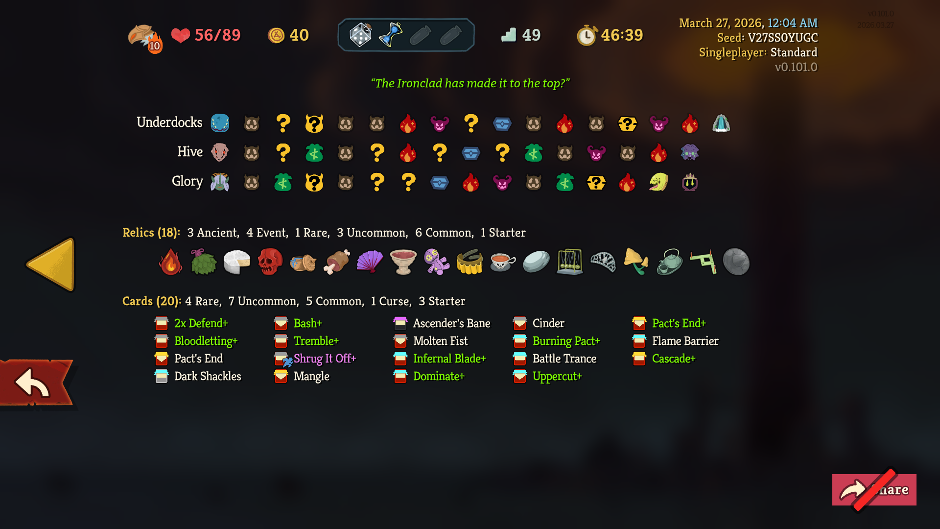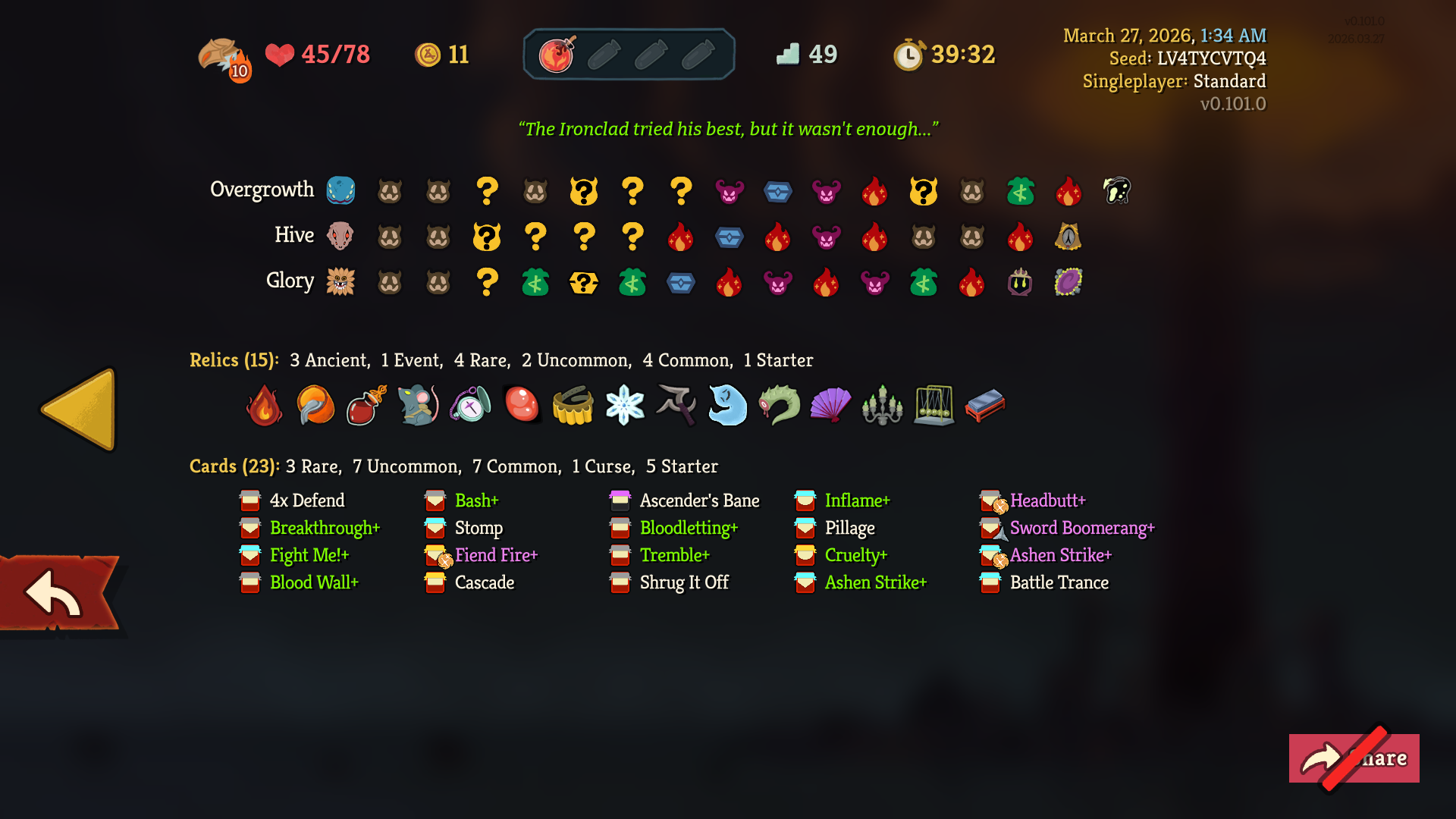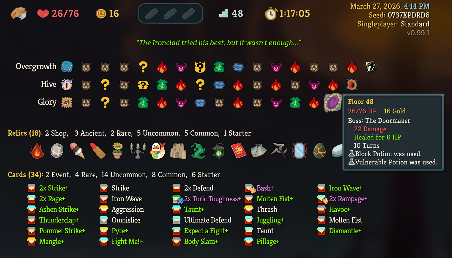 >>735827178>>735827319While I had this absolute war crime of a card, I never top decked it or any of its brothers. I was basically leaning on the white beast statue for the entire run because my damage output was fucking abysmal. I'd nearly die every other fight.I actually only rested once in act 3, and it was just so I could go into a ? room before the next fire without risking dying.