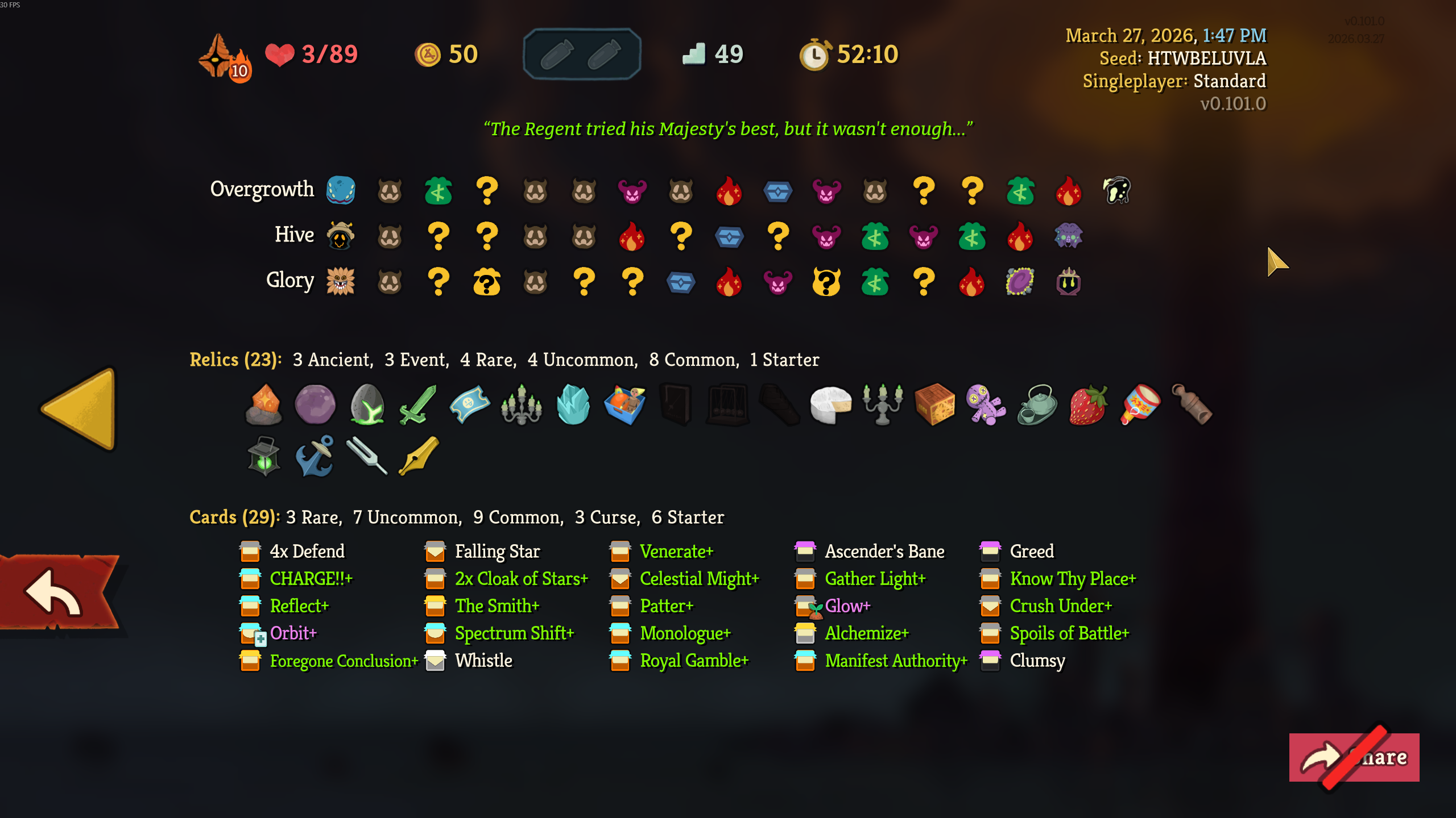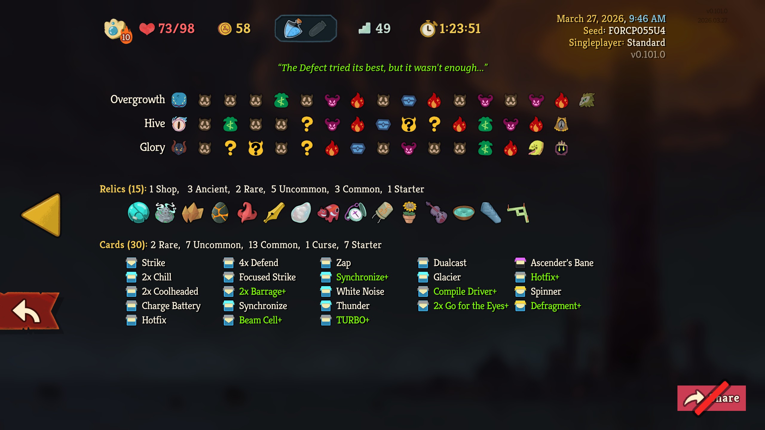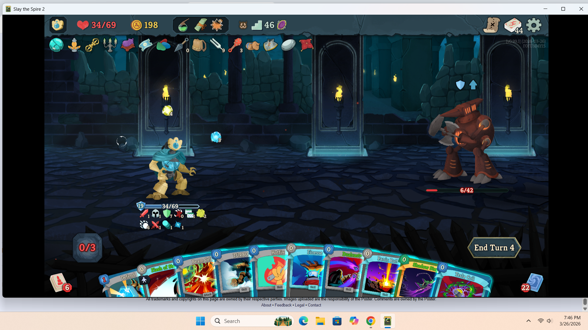 >>735827178>>735827319While I had this absolute war crime of a card, I never top decked it or any of its brothers. I was basically leaning on the white beast statue for the entire run because my damage output was fucking abysmal. I'd nearly die every other fight.I actually only rested once in act 3, and it was just so I could go into a ? room before the next fire without risking dying.