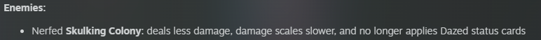 >>735795160>Nerfed Skulking Colony: deals less damage, damage scales slower, and no longer applies Dazed status cardsAlso they changed doormaker, again.