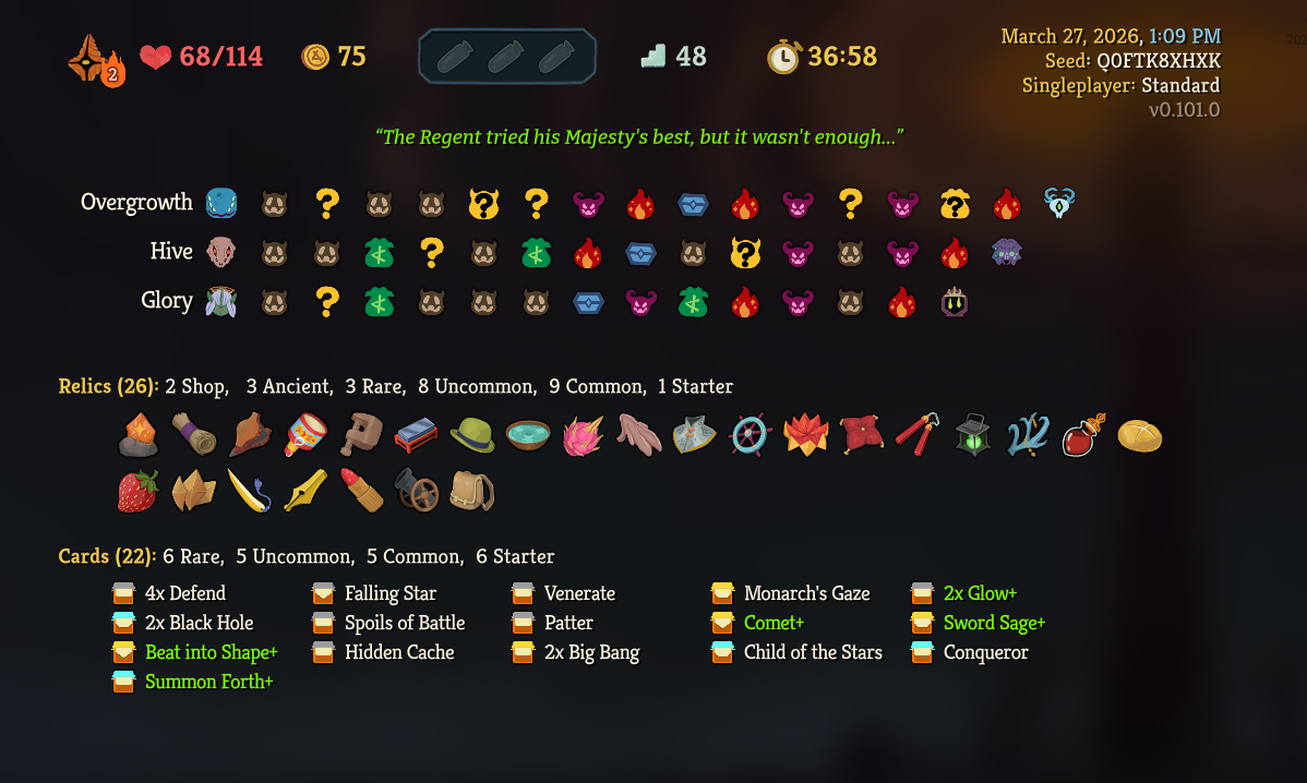>struggling to close out Regent runs>first run of the new patch is a win>with a trash / forge deckJust kidding, it was basically a history course win