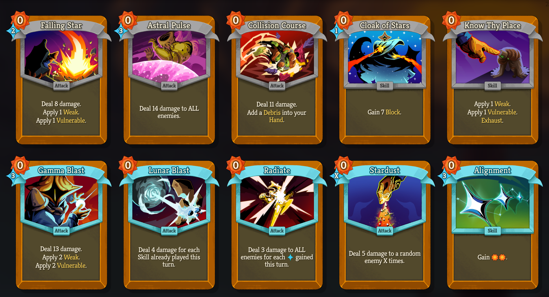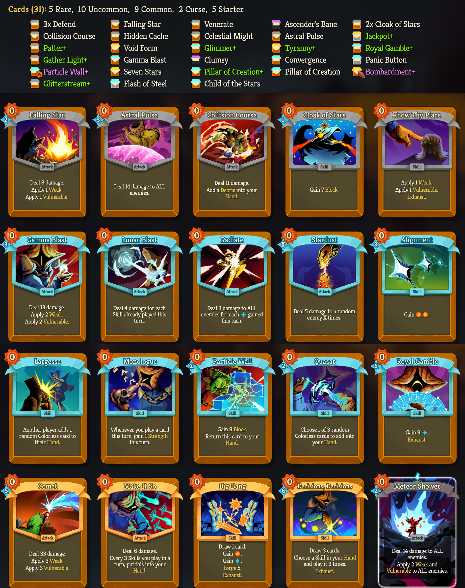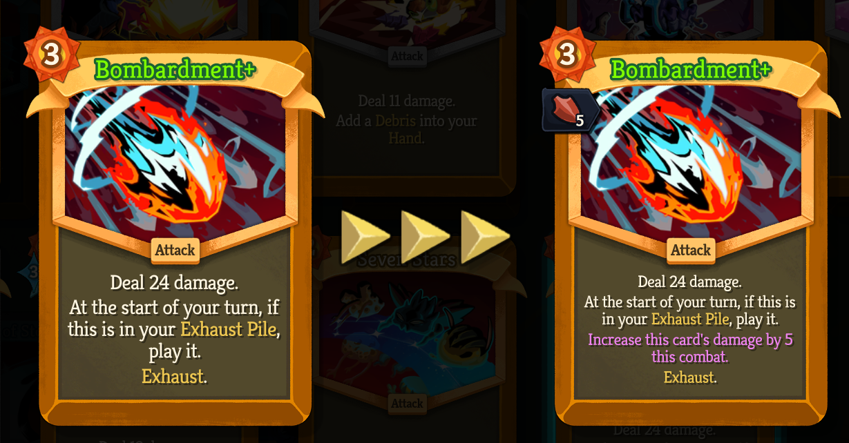 >>735795160>Reworked Arsenal card: "Power - Rare - Cost 1 Whenever you play a Colorless Card, gain 1(2) Strength." -> "Power - Rare - Cost 1 (Innate.) Whenever you create a card, gain 1 Strength."Weaker, but now it's at least consistent? It's no longer explicitly Colorless cards but creating any cards. This means it now synergizes with creating Status cards like Debris via Collision Course and Crash Landing, plus Largesse in multiplayer.>Gloom Ascension modifier no longer affects ? rooms in addition to Rest Sites>I will be looking to rework Gloom entirely in the future to a modifier that makes the game harder but in a more interesting way.THANK FUCK>Buffed Cinder card: now Exhausts a random card in your Hand instead of the top card of the Draw PileVery nice change, now it's a lot like True Grit>Changed Tremble card: now ExhaustsIt needed this>Buffed Serpent Form: Damage increased from 4(5) -> 4(6)Serpent Form sucked in most decks besides shiv abuse, now I hope it'll be more worth it because each card will now come with a free Strike of damage>Buffed Glitterstream card: Next Turn Block increased from 4(6) -> 5(7)Very good, now Glitterstream is a much better block solution for Regent>Buffed Parry card: Block gain increased from 8(11) -> 10(14)Look MegaCrit, just rework it to give block while holding Sovereign Blade. It'll make more sense that way too. Sure the boosted block actually helps Regent survive after spending 2 energy to Blade, but come on>Buffed Refine Blade card: Forge increased from 6(10) -> 9(13)Muuuuuch better>Changed Spoils of War card: now draws 2 cards, but Forge decreased from 12(17) -> 5(8)Seems now Refine Blade is the go-to big Forge generator card for cheap commons. Nice of Forge to get its own draw>Buffed Celestial Might card: Upgrade changed from +2 damage -> 1 additional hitBetter synergy now with Vigor. Sure it's still 2 cost, but it's common compared to Lunar Blast, Stardust, etc.