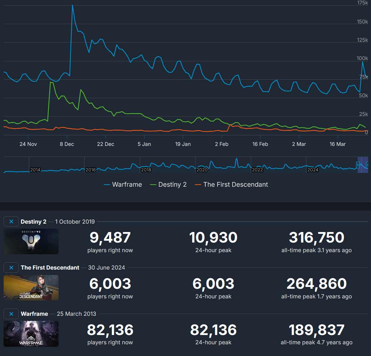 Warframe. Thats it. You dont see say BDO or Vindictus get much seethe. Compare how relatively calm the vindictus defying fate demo was. Its the same reason marvel rivals also had seethin OW faga seething in them