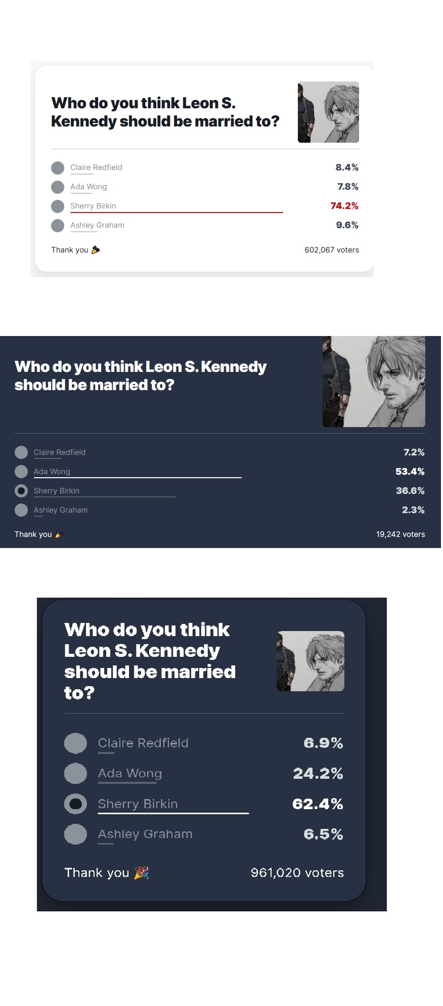 >>735884994you just know the ign person in charge of the poll went home crying about gamers ruining it and how ada clearly should have won, especially after they rigged the second poll