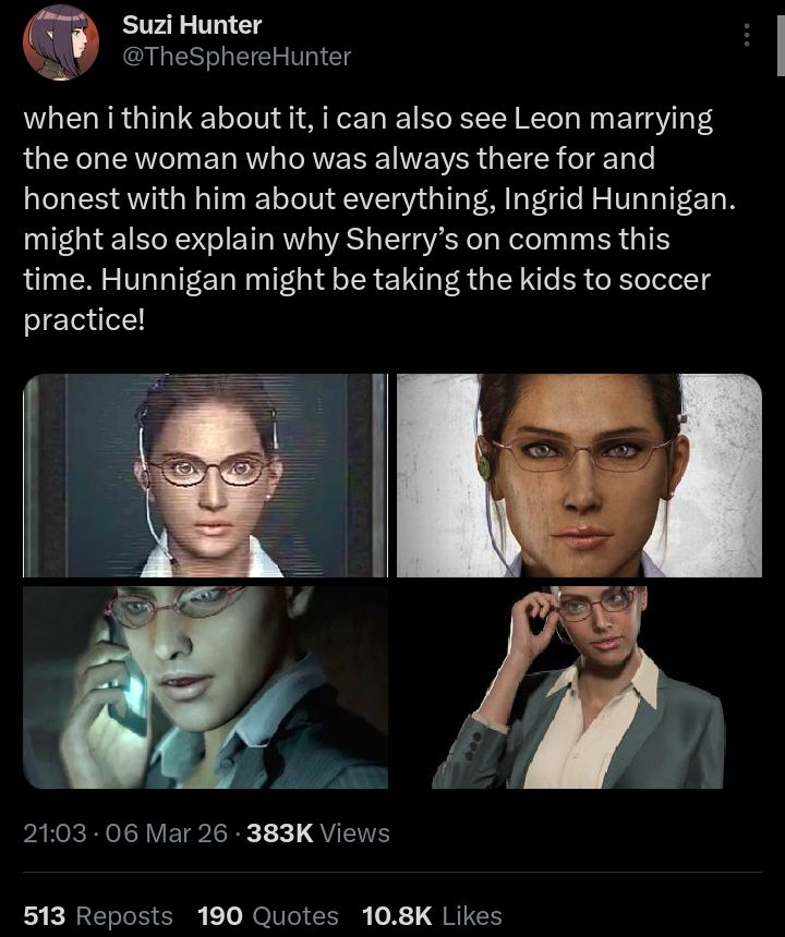 >>735884850It’s not just the ring, though. There are a few hints. The way Sherry calls Leon “anata,” Leon desperately calling out for Sherry when he was dying, and Grace bringing up Sherry during her call with Leon even though the game never mentions her otherwise to grace all suggest that Grace already knows Sherry on a more personal level. This might be a stretch, but the fact that Claire isn’t mentioned in their flashbacks could also hint that things became a little awkward between the three of them because Leon and Sherry are a couple. Also Leon was clearly worried that he got infected, but at the same time, there was also a bit of relief in his words when he said, “At least we’re in this together, right?".