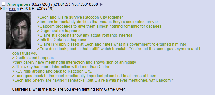 >>735878060>Leon and Claire survive Raccoon City together>fandom immediately decides that means they’re soulmates forever>Capcom proceeds to give them almost nothing romantic for decades>Degeneration happens>Claire still doesn’t show any actual romantic interest>Infinite Darkness happens>Claire is visibly pissed at Leon and hates what his government role turned him into>"You don’t look good in that outfit” which translate “You’re not the same guy anymore and I don’t trust you”>Death Island happens>they barely have meaningful interaction and shows sign of animosity>Jill lowkey has more interaction with Leon than Claire>RE9 rolls around and back to Raccoon City.>Leon goes back to the most emotionally important place tied to all three of them>Leon and Sherry are having flashbacks...but Claire’s was never mentioned. wtf Capcom?Clairefags, what the fuck are you even fighting for? Game Over.