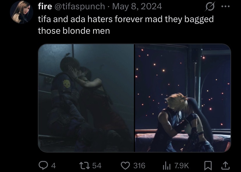 >>735981554Re2 Remake started it by going with the worse version of her death. Classic RE2 had Leon B as canon, which mean Ada "died" by being thrown into a computer console while trying to help Leon with Mr. X. She "died" in his arms, selling a line that he'd changed her and they kissed. The bridge drop version doesn't even come close to it for making Leon simp for decades.