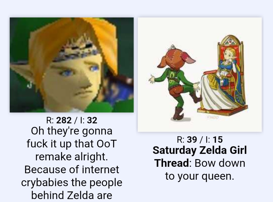 >>735911171I feel you.Remaking older games with the BotW template is the perfect way to streamline them for people who hate the idea of playing a game with a linear progression and a structured format. And you just know they're itching to 'fix' certain things that don't need fixing as well as bring in a bunch of other bullshit that wasn't present in Ocarina of Time.