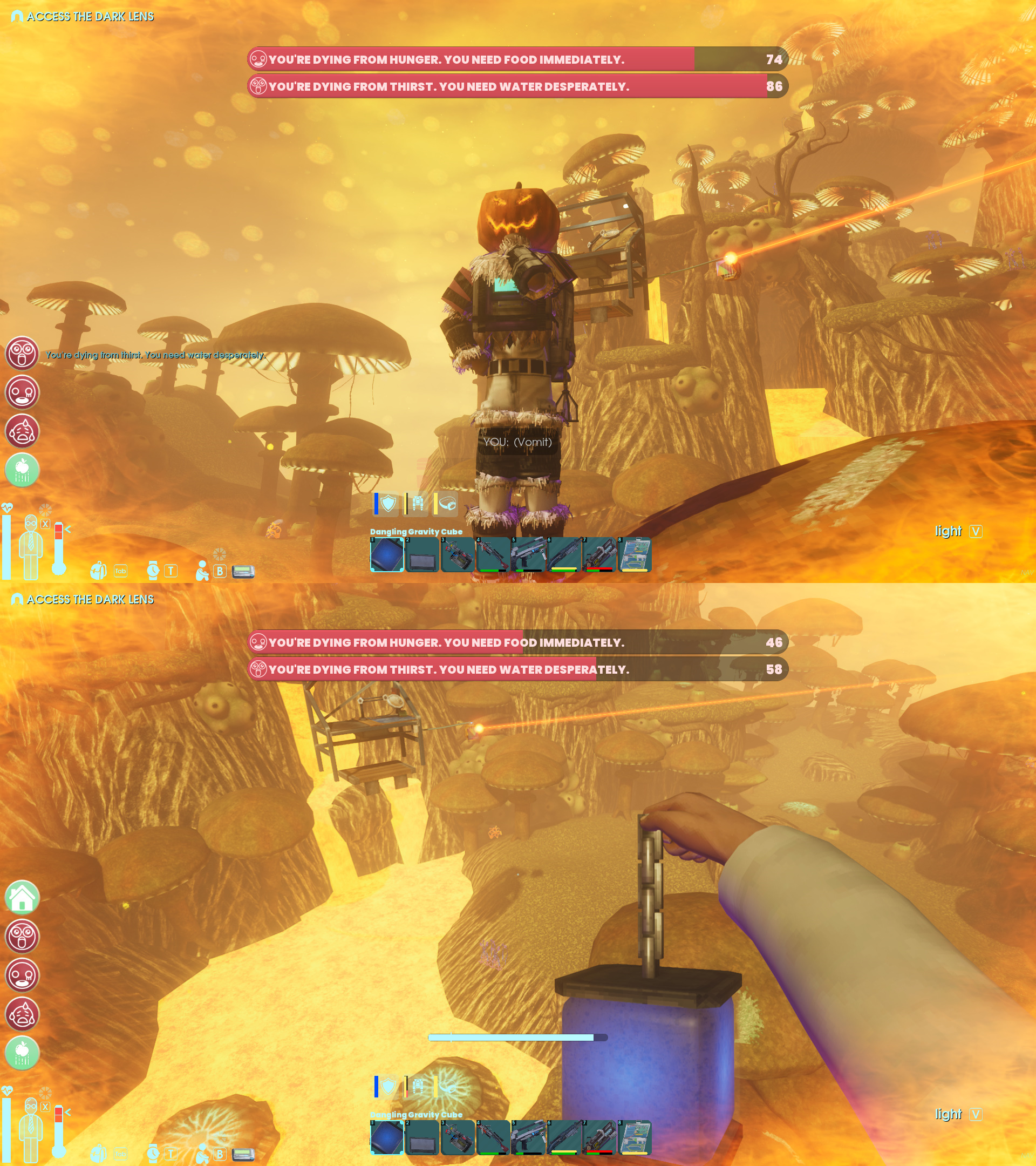 >>736048350If you don't feel like buying/wearing the heat suit, you can just consume slushies and run in with the Forge arms and torso if you don't have weathered. If you take your time you'll probably need about 3 slushies. The heat suit is still pretty easy as a method. You trade an air compressor to the blacksmith for it.Alternatively you can just pack soup, run fast and puke your way through it anyway. When your hunger timer is counting down, you can eat raw meat to reset it if you want. What are you gonna do, puke up your nothing? It's free delay tactics.