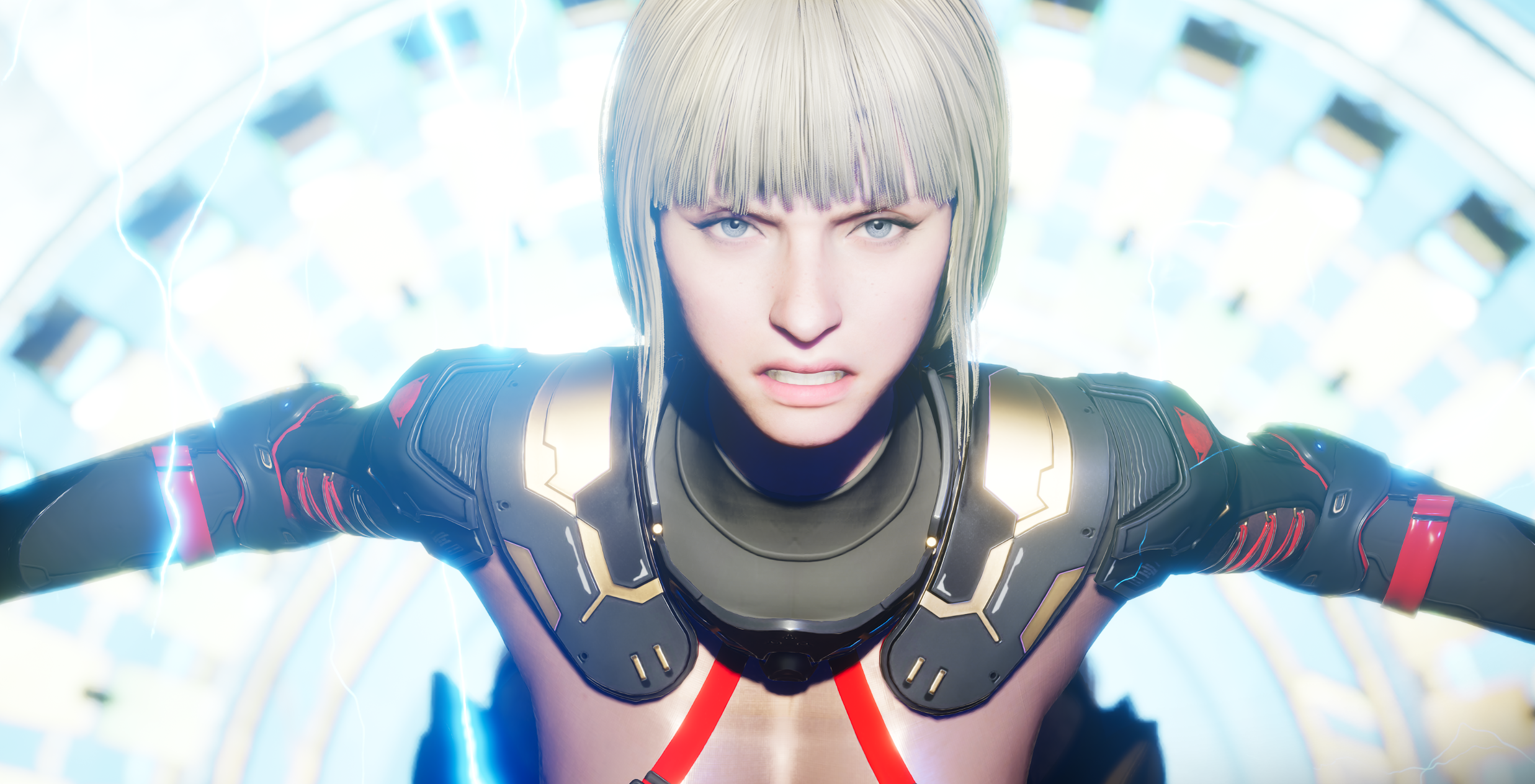 >decked out in multilayered composite nanite armor with super advanced ray gun tech