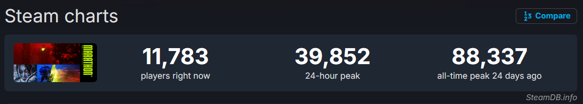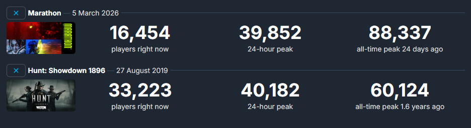 >>736029137Yes, this is real. SteamDB shows a 24-h peak of 39,852 players for Marathon and 40,182 players for Hunt Showdown. You can confirm those numbers by looking at SteamDB yourself retard.