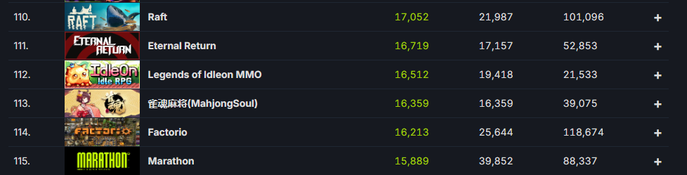 >>736022681Factorio is kamige construction and management sim.Mahjog Soul is majong, free Raft is survival crafting on a raft.Eternal Return is f2p chink Persona5 mobile top down game.IdelOn is f2p 2d pixel MMORPG.