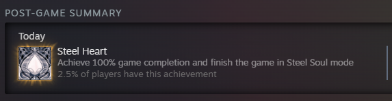 I got 100% in around 60 hours and left the game at that, I don't have the autism needed for steel soul. Looking forward to the DLC.