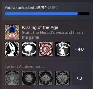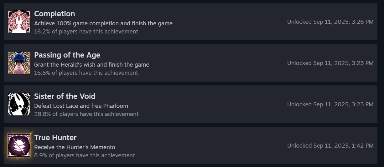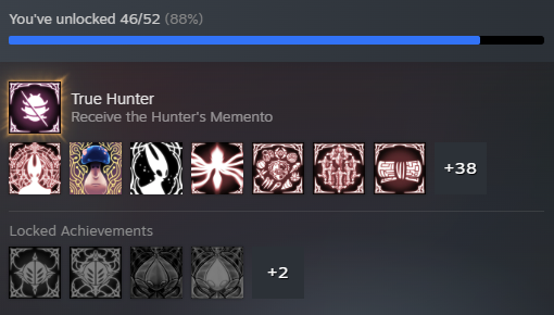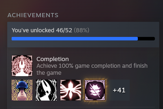 Speaking of achievements, why the fuck have so few people completed the first game? More people completed the true ending of Silksong (28.8%) than even just the basic ending of HK (24.1%)