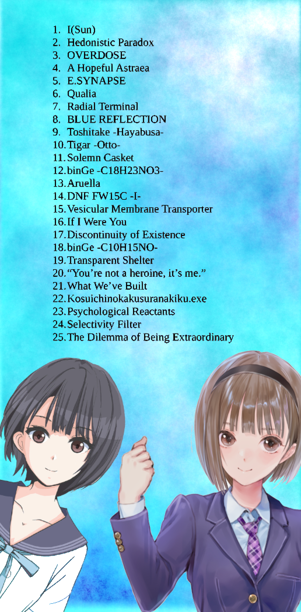 I ranked my top 25 tracks from the Blue Reflection games for my own amusement while listening to the soundtracks, and put the list on an ugly background that make it less readable because that's how I roll. I ended up with 19 tracks from BR1, and 6 from BR2. I'm combining highly similar tracks into the same entry, e.g. I(Sun)/(Cloud)/(Rain).