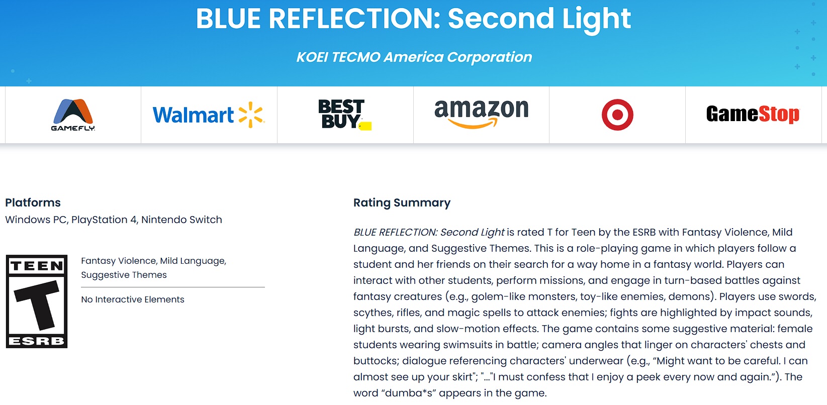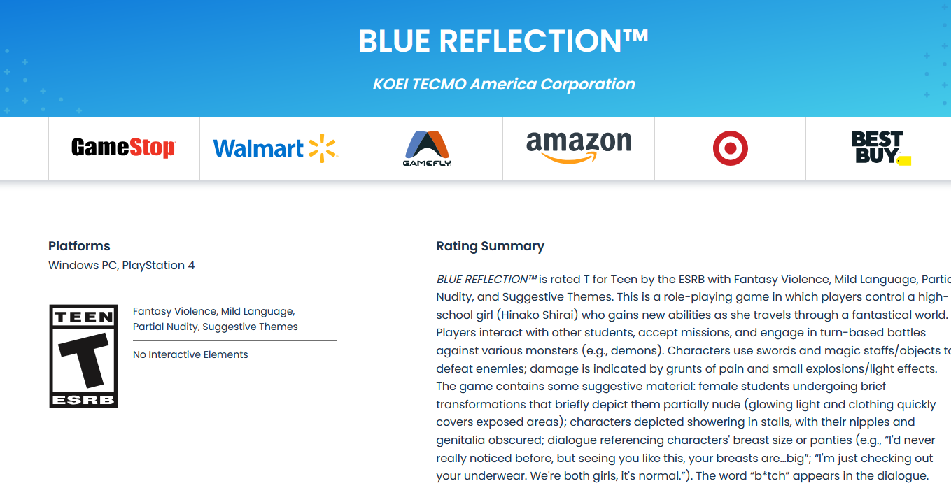 >>736165552The rating summary of the original game, yeah. It's likely that they change or remove some lines of dialogue considering what the ESRB mentioned there, if not, at least it's a fact that multiple scenes will he censored with towels or more clothing. If one pays attention to the content descriptors, it's obvious that only the first Blue Reflection game has ''Partial Nudity'' as one of its content descriptors, the other releases, they have the content descriptor ''Suggestive Themes'' but not ''Partial Nudity'' too, and in fact, if one doesn't count re-releases or DX editions of games that were already available, Blue Reflection was the last game developed by Gust that had ''Partial Nudity'' as one of its content descriptors...