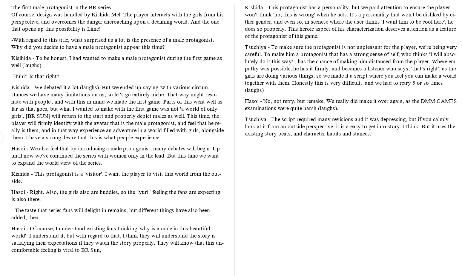 >>736161854I tried searching and it was probably from this interview. But the wording is a bit different, so I might confuse with different one, or I just misremember it a bit - https://www.famitsu.com/news/202211/25282762.htmlMTL of the relevant part: "Of course, I understand why long-time fans might be thinking, “Why is there a man in such a beautiful world?” I get it, but if you watch the story closely, I believe you’ll find that it meets your expectations and leaves you satisfied. That sense of dissonance is exactly what BR SUN needs."