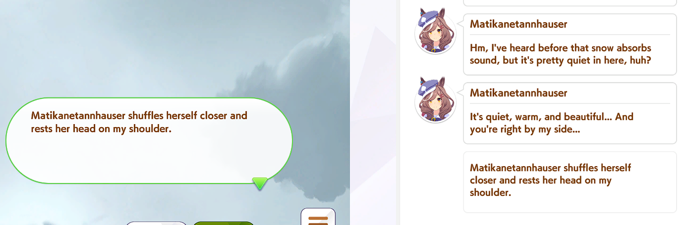 >>736143482Depends. Are you chatting with OCs or canon characters?