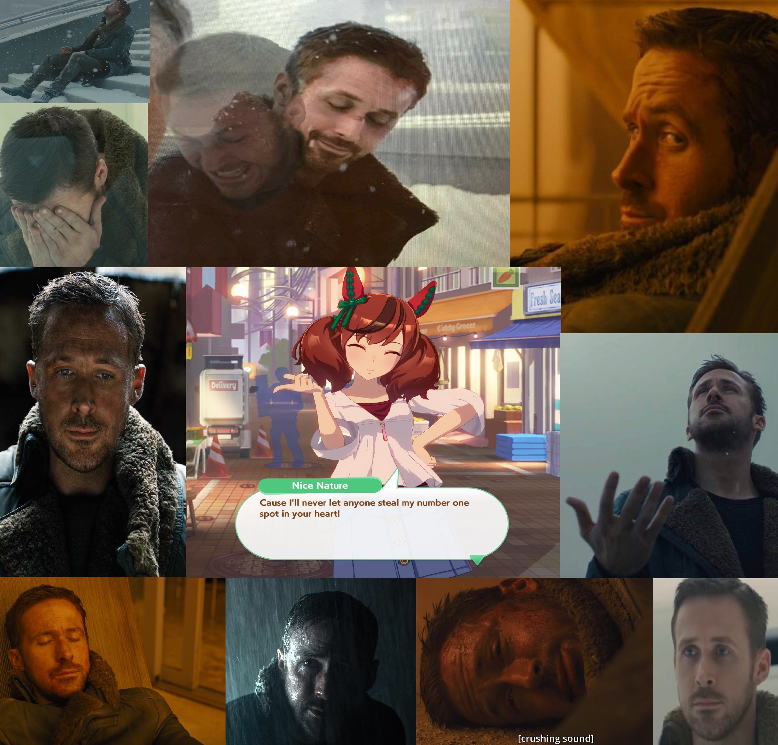 >>736050851>Has a vidya romance ever actually made you feel something?yes>cute japanese girl begging MC to take him back to see her boyfriend who was told he died>Upon meeting she tells the boyfriend to marry her and make amends with her family>Says yes and carries her into his home>RyanGosling.gif
