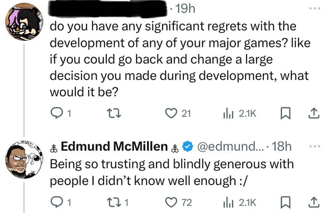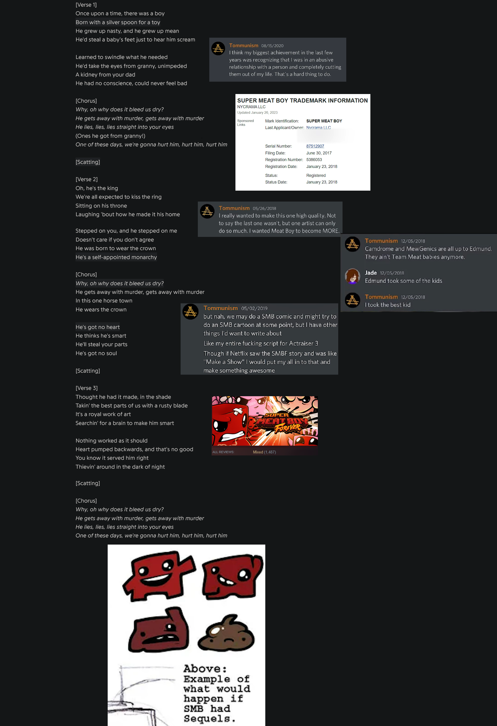 >>736083269A lot of speculative headcanon, but the funniest part is this:>edmund doesn't know how to run a business>tommy picks him up and tells him he'll take care of the business side, and they create team meatOh yeah? Is that why Steakmund needed Tyler Glaiel this time around? So he'd run his business? No, retard. Edmund can't code these games. Super Meat Boy was a team effort and Tommy was obviously a significant part of it just like Tyler is a significant part of Mewgenics this time around. We don't know shit about what happened there. See: >>736071523
