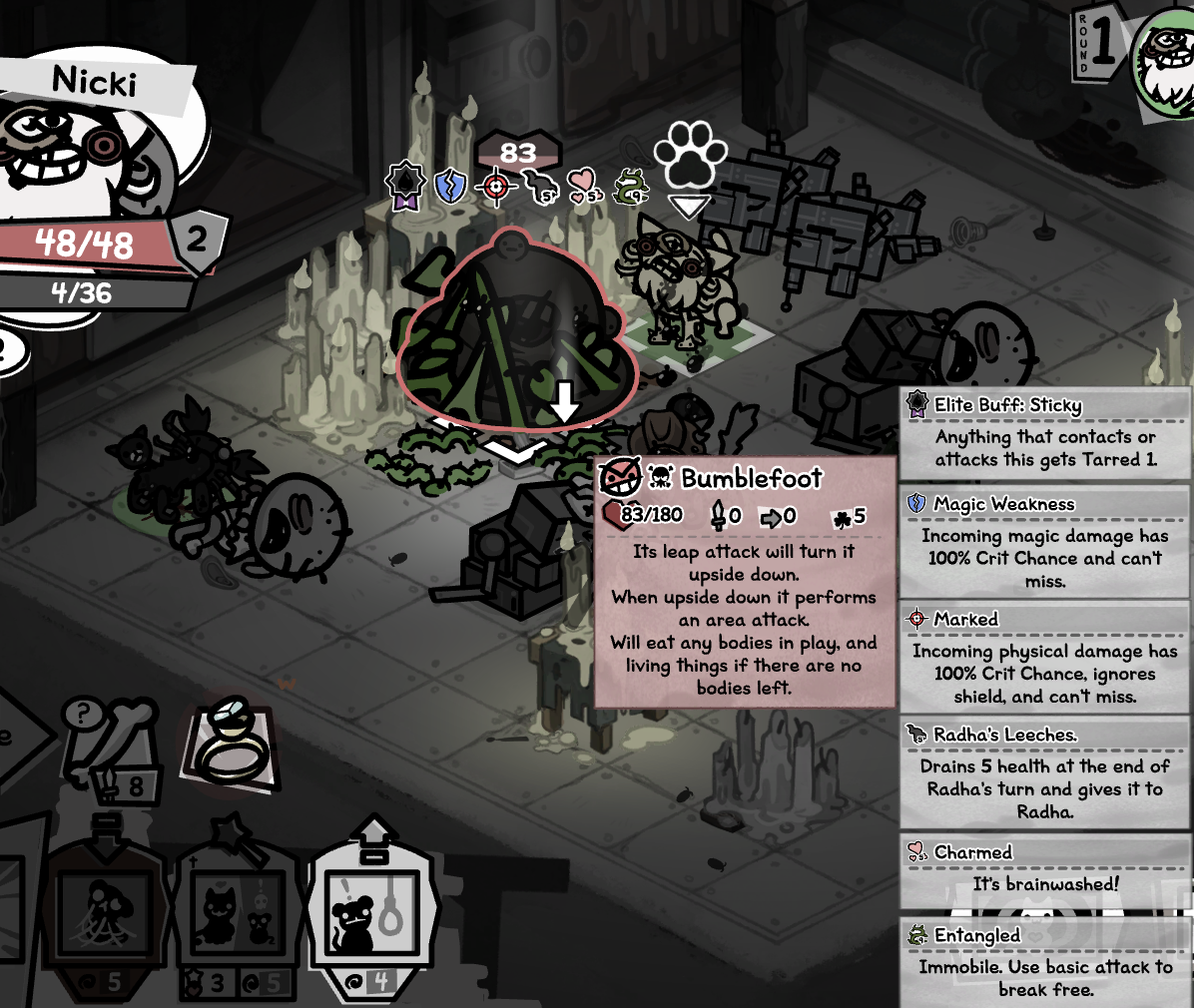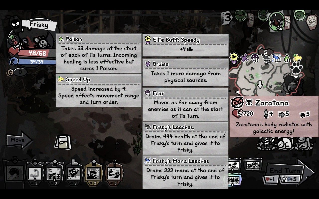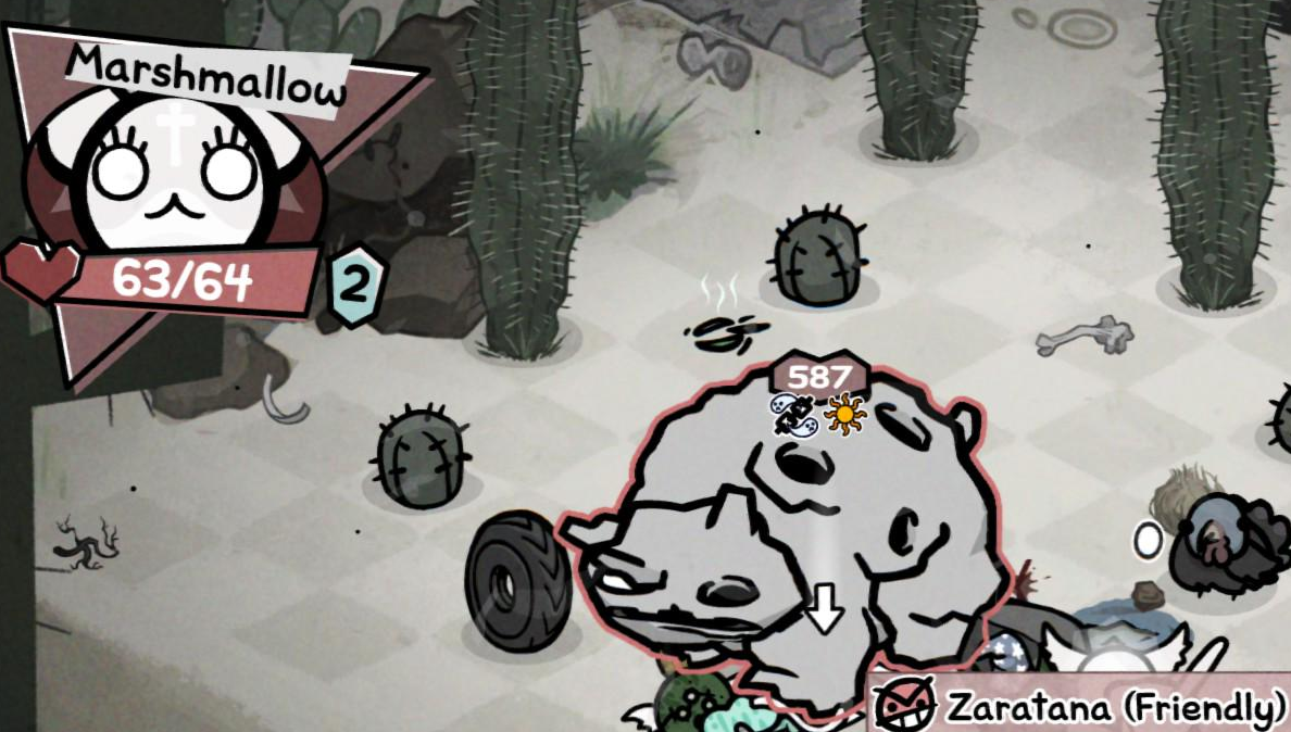 >>736066436ALWAYS end the round on her one-tile instakill, and never leave cats sitting to her side.Since her attacks cycle in a fixed order when you hit her you can reliably land 1/5/9/etc. attacks per round without ever being damaged by her second turn.Follow this and you'll only get hit by her first turn, which isn't that bad. Avoiding that probably isn't worth it since it runs the risk of her turning 90 degrees which can fuck up your positioning with retaliatory damage a little bit. Manageable either way.Avoid uncontrollable familiars or kill them off at the start of battle.