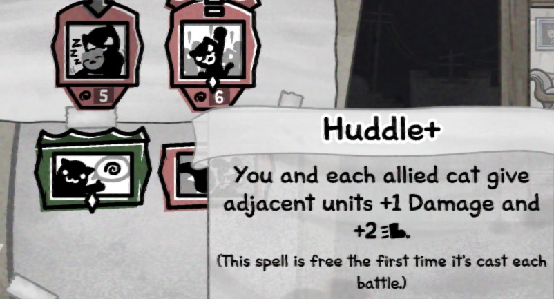 Hunter's Boon is silly in general, but it's VERY silly with Huddle.>cat outspeeds the rest of the team>Huddle>run over to an enemy, kill them (thanks Punch Face)>Huddle five times>kill another enemy>Huddle five more times>teammates have now given each other more damage ups than they could ever need and can cross the entire map