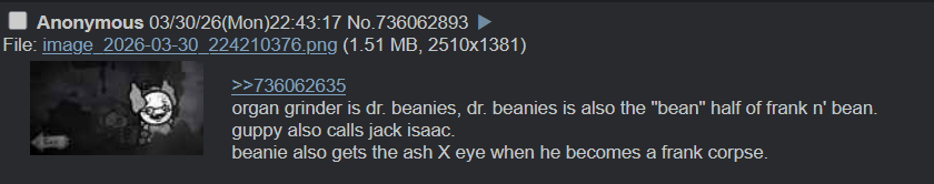 >>736063408The most terrifying part of this is that it makes complete sense for basement 4 to be a flesh domain because throbbing king exists.The implications for isaac are nightmarish.>dr. Beanies specializes in mass cloning and extreme gene manipulation, to the point of cloning stacy over 10,000 times, and has experimented on humans before>maggy was actually going to build the basement floors from the binding of isaac, including womb and sheol>edmund has long stated that almost all enemies in binding of isaac are actually isaacJesus fuck, her basement not just being real but full of mutilated isaac clones.
