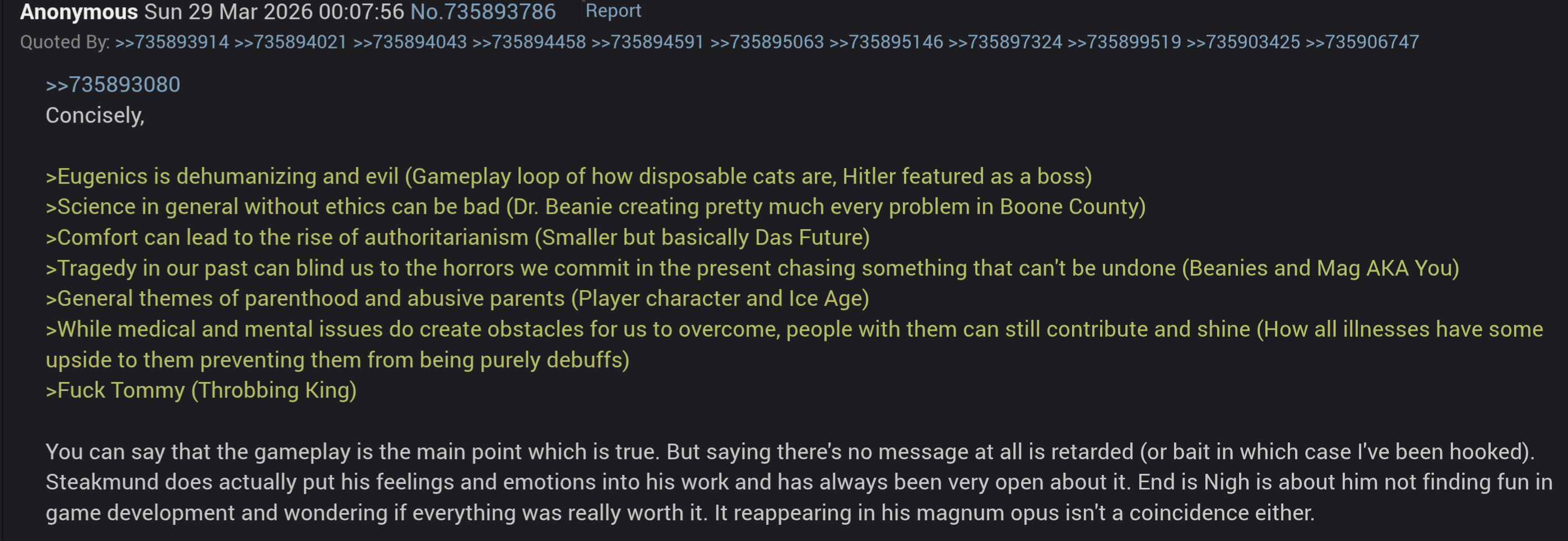 >>736067191>>736067331yeah, but then he made TEIN anyway which is for all intents and purposes just a slightly more-IWBTG-y meat boybut to be fair my understanding of that game is that he basically made it at a low point in his career where he wasn't sure he wanted to make anything anymore