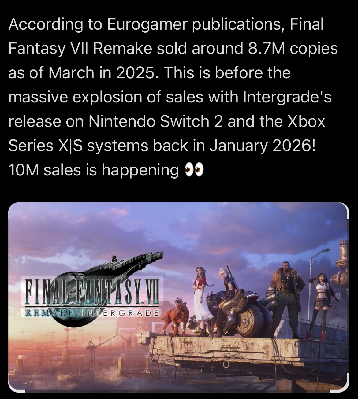 >>736108673>How well is it selling?Naoki Hamaguchi: “The second entry, FFVII Rebirth, has been doing very well on both PS5 and PC. I know some fans have expressed concerns, but please rest assured, we’ll be able to deliver a proper, high-quality third installment.”