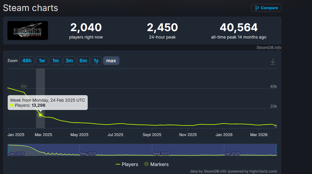 Square Enix is going to learn why we stopped the whole episodic games thing. You naturally just bleed players from installment to installment not gain them. And FF7R has extra baggage since it's not a remake and imo necessitates having the context of at least FF7OG. This whole remake project has just felt incredibly stupid to me.
